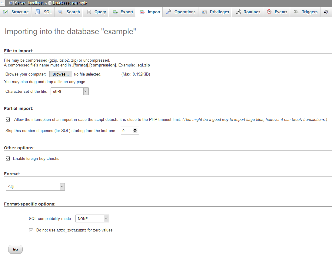 To Import the file, login to your database management system, such as PHPmyAdmin. Make sure you are on the database that you named in the database.php config file then locate the Import Tab on PHPmyAdmin.