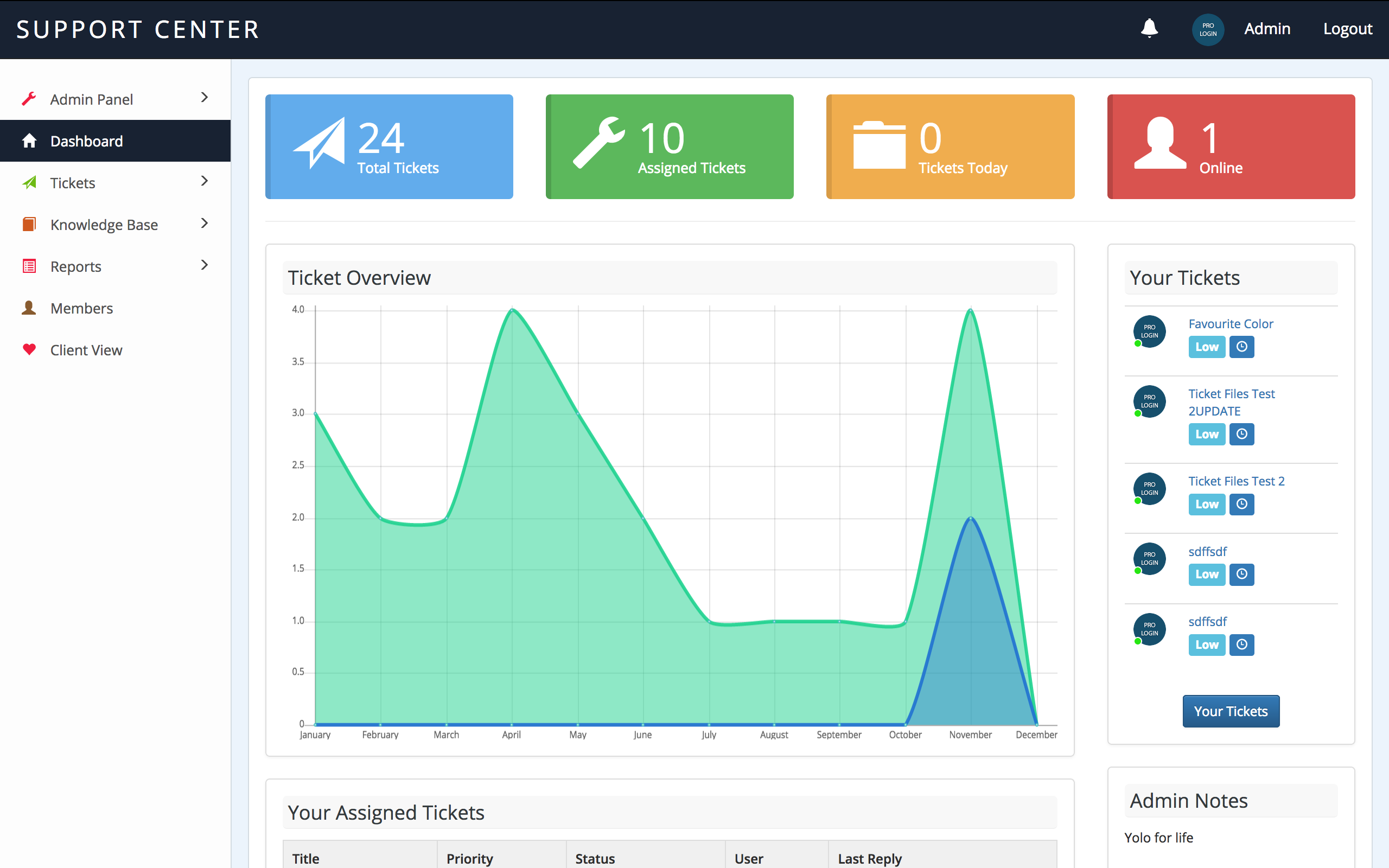 The dashboard for the Support Centre will give you a quick overview of your system. This dashboard is only seen by users with staff privlidges i.e. Admins, Ticket Managers, Knowledge Managers etc.