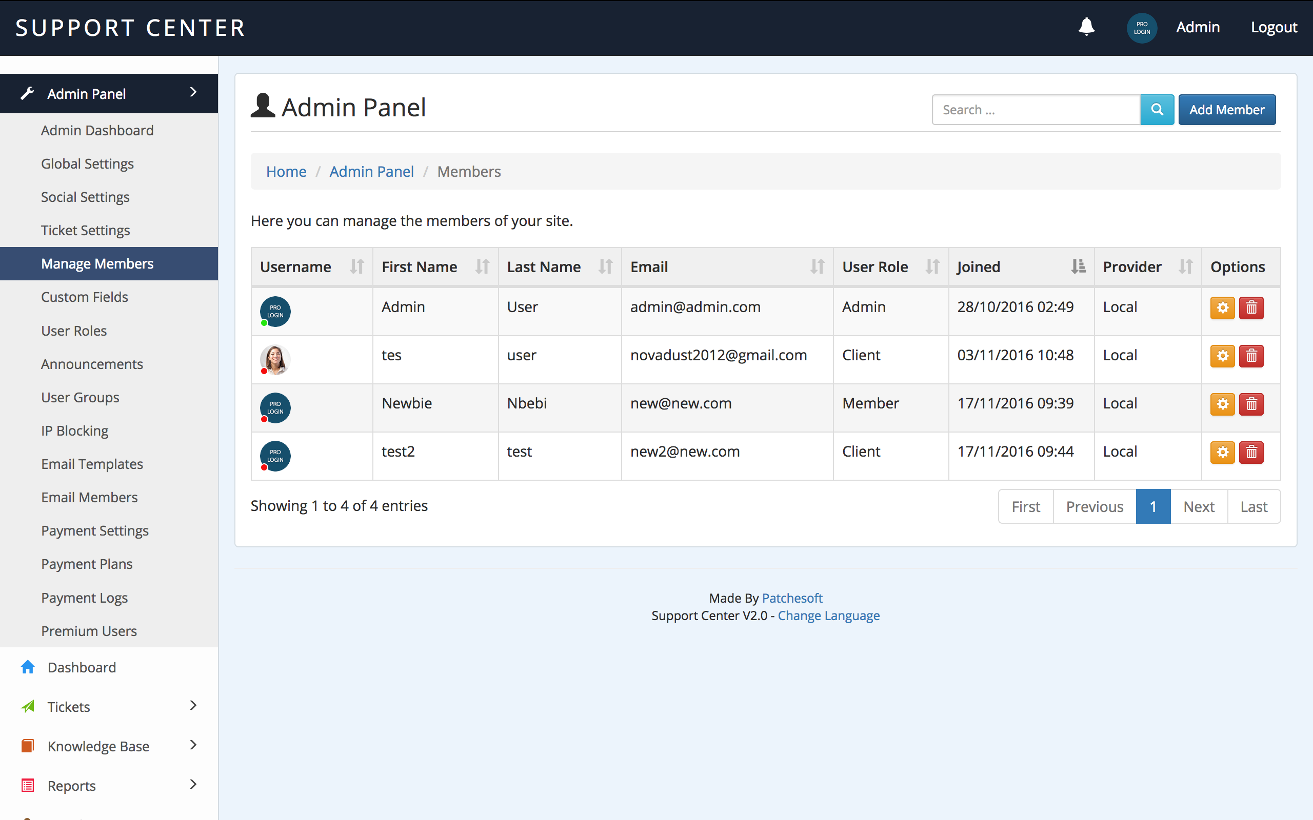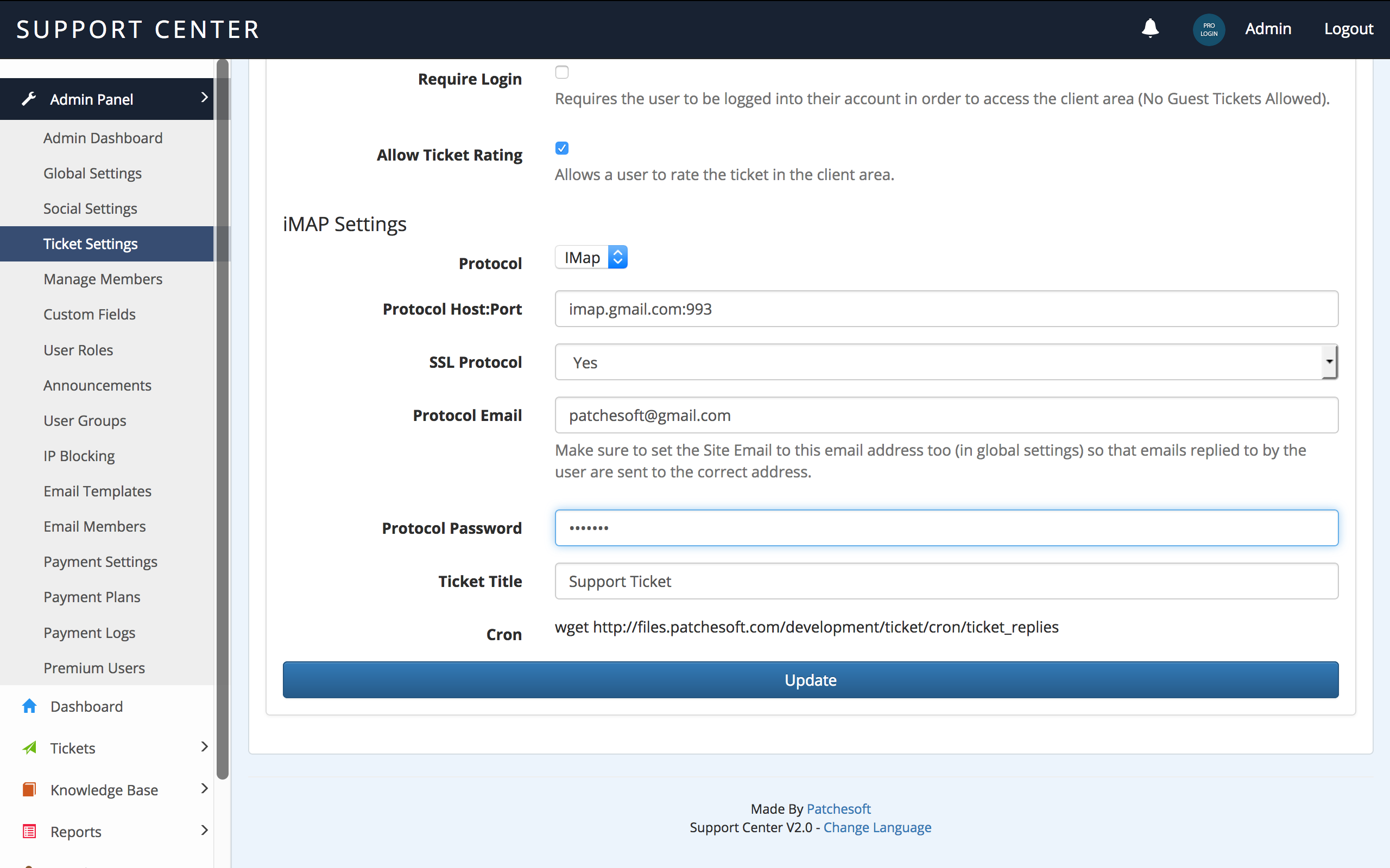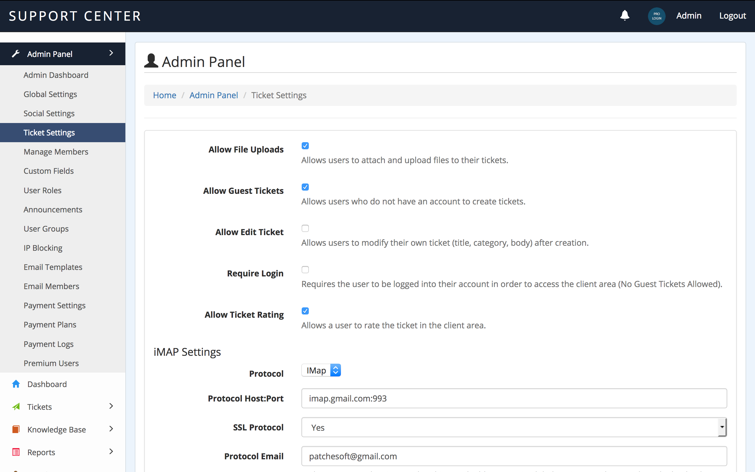 Users with the Admin use role will be able to modify Ticket Settings in the Admin Panel. Some of the options include disabling file uploads, disabling guest tickets and more.