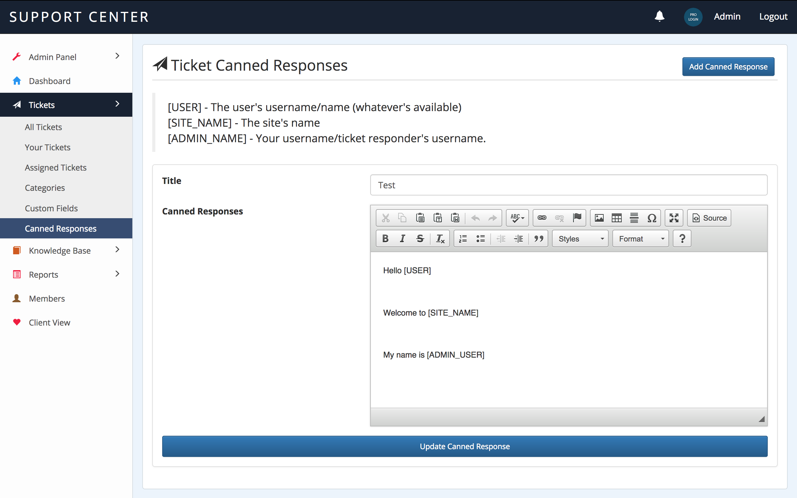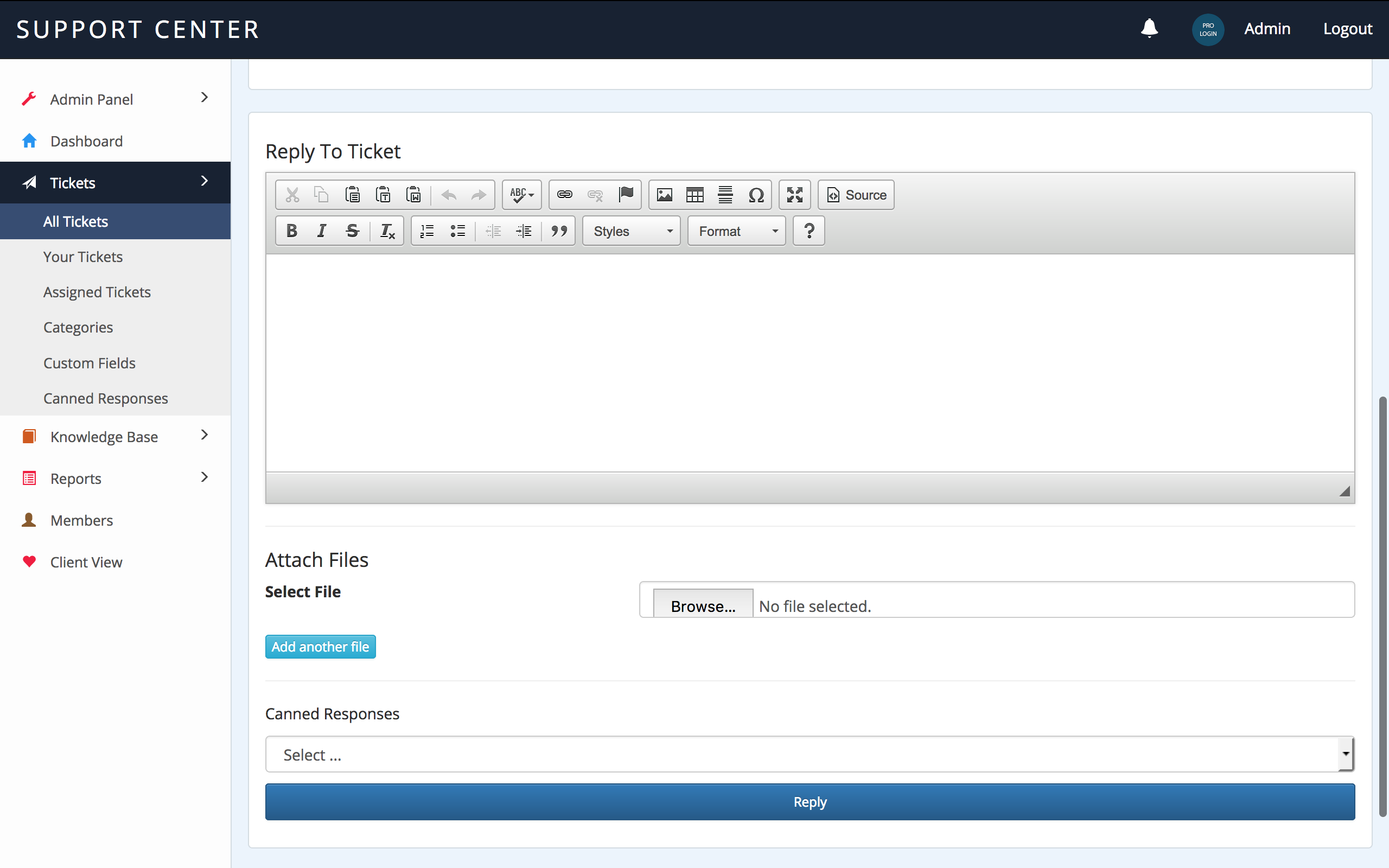 Staff also have the option of using Canned Responses. These are replies that have been created in the Canned Responses section that allow you to quickly reply to tickets with a standard response.