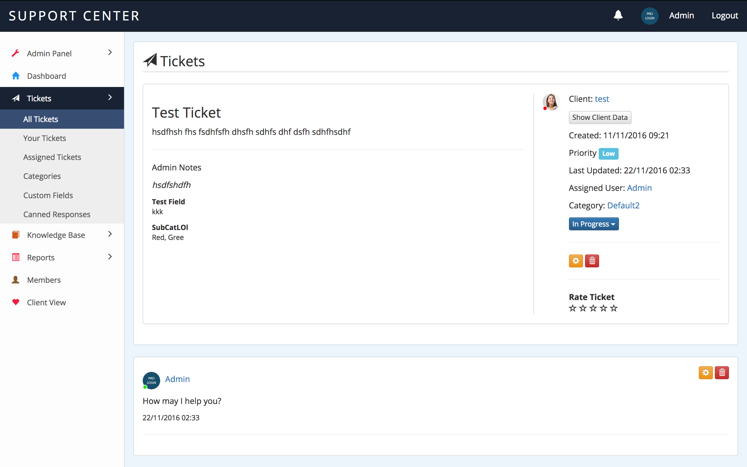 When you click on View Ticket, you'll be able to see all the details of the ticket, including the Client, Ticket Replies, Status, Priority and any custom fields you have created. From this page you can also reply to a ticket, update the status and edit/delete responses.